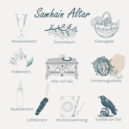 Gestalte einen kleinen Altar mit Fotos, Symbolen oder Gegenständen deiner Vorfahren und der Elemente. Stelle eine Kerze für jede Generation oder für besondere Ahnen auf. Lege vielleicht ein Stück Brot, Obst oder ein Schluck Wein dazu – als Gaben der Dankbarkeit.